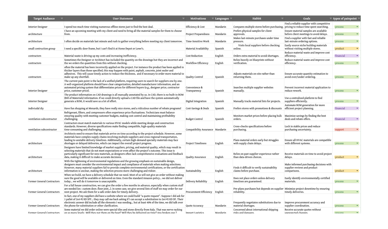The raw data fell into 6 distinct classes namely :User Statements, Motivation , Languages, Habits, Goals, and Types of Pain Points.