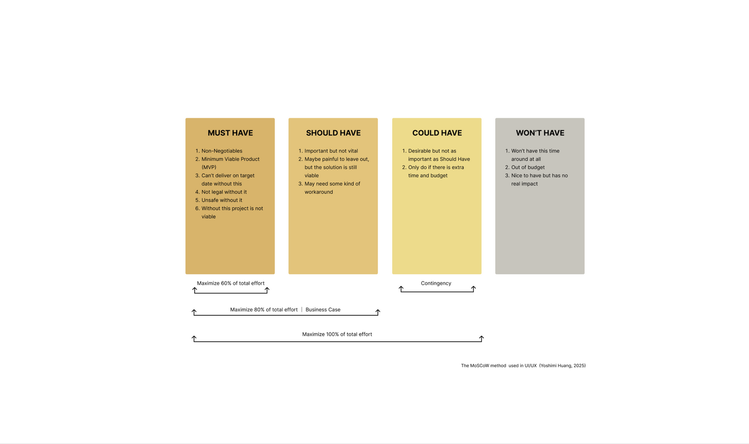 Prioritizing features is crucial to balancing business goals, client expectations, user demand, and technical feasibility. Using the MoSCoW method, I categorize features into Must-Have, Should-Have, Could-Have, and Won’t-Have to ensure a structured, goal-oriented approach to product development.