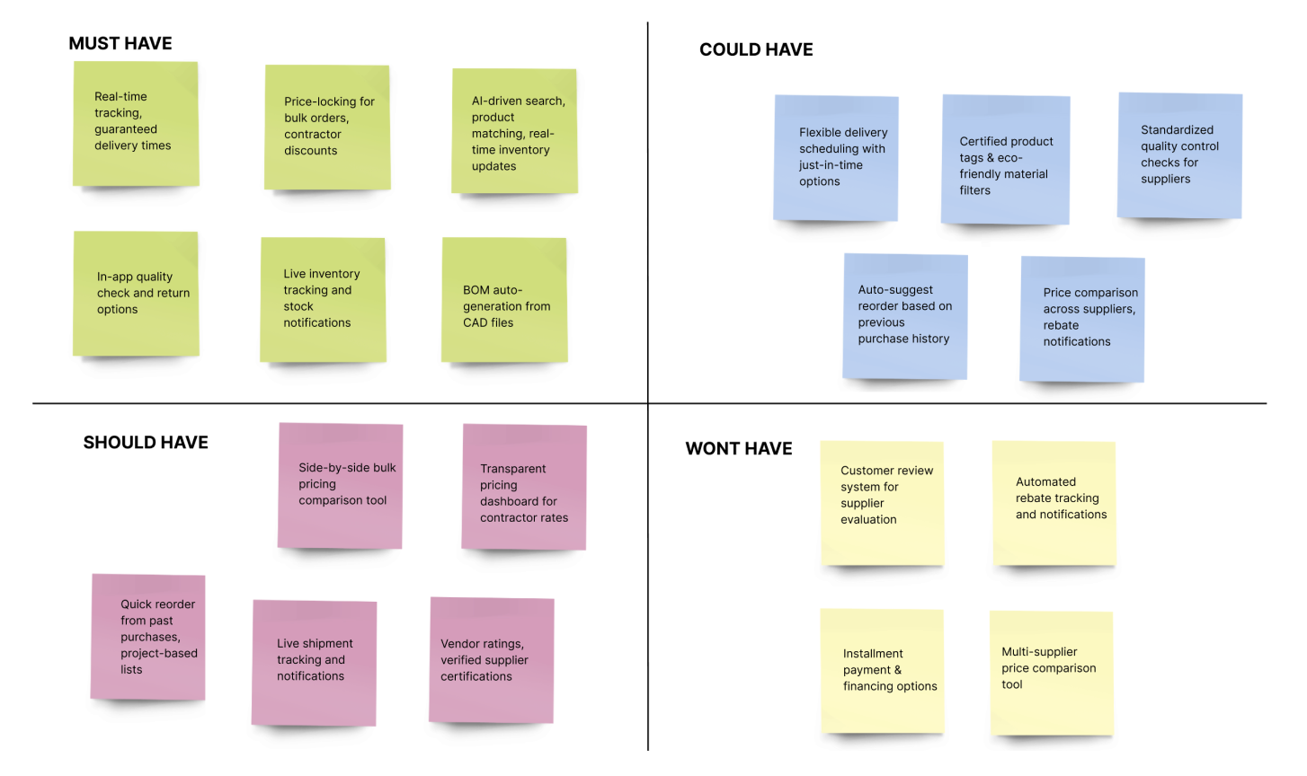 User Demand: Does the feature address high-friction problems for key user groups (e.g., contractors, architects, suppliers)? Does it enhance core workflows such as ordering, price comparison, and logistics tracking?