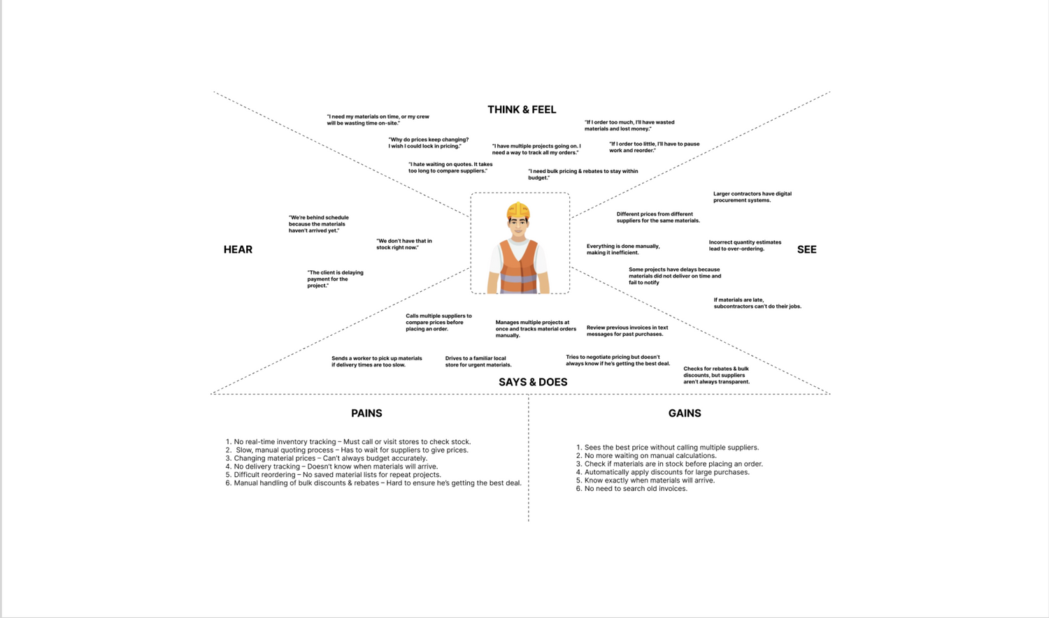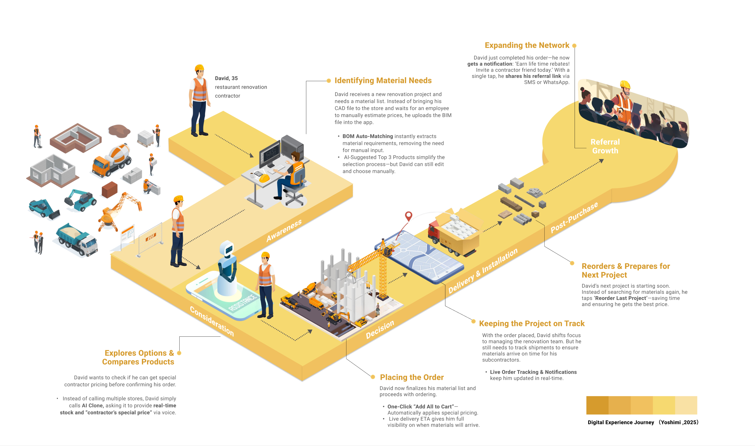 I visually illustrate how my user persona (David, the general contractor) interacts with my app at different stages of procurement.