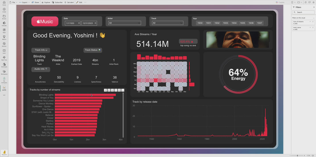 This heatmap visualization was created using Deneb in Power BI, leveraging a custom template from PowerBI-tips GitHub. It provides a time-based analysis of music streaming trends.